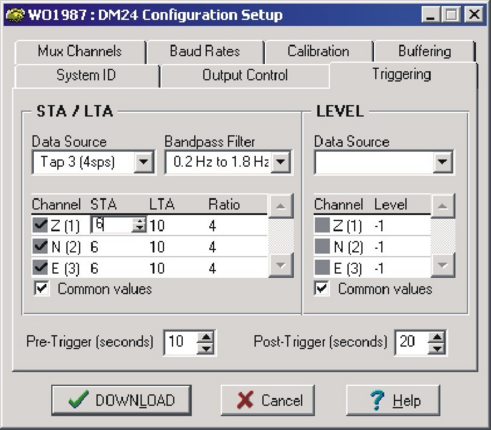 For each tap there are two rows of check-boxes where the user can tick either triggered or continuous data outputs. The digitiser applies a simple short term average (STA) ÷ long term average (LTA) algorithm and/or an absolute level (counts) algorithm to a selected stream or set of streams to determine whether the trigger condition is met. These streams may be bandpass filtered before evaluation using standard bandpass parameters. The data transmitted due to the trigger may be from different streams than those used to determine the trigger.