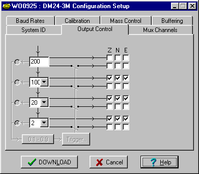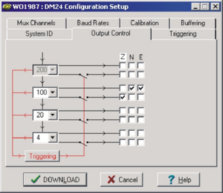 Stream selection: The digitiser has three channels or streams. These are depicted by the three columns labelled Z, N and E in the Output Control window shown above.