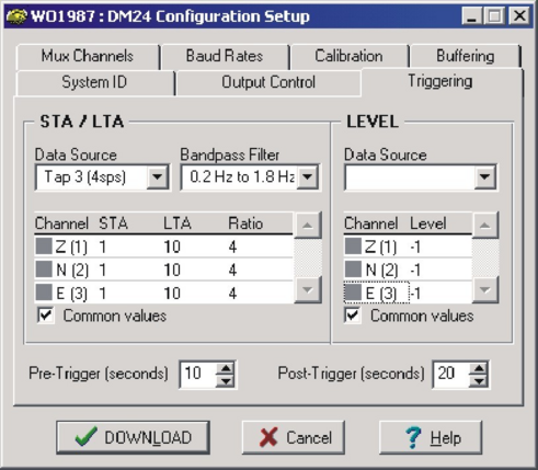 Level triggering parameters: The user specifies the Data Source, channels and levels by clicking on them, similar to the STA/LTA settings. The levels are specified in counts.