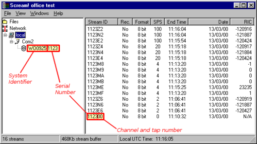 The Stream IDs displayed in the main Available Streams window have six-character ID’s. The first four characters identify the digitiser and the last two characters identify the stream from the digitiser. The first of these two characters identify the channel, while the second defines the ‘tap’, or digitiser output ( see Data Transmission Protocol & Data Block Structure later).