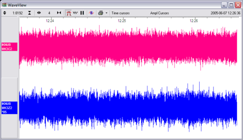 Open a Waveview window on the calibration signal and the returned streams by selecting them and double-clicking. The streams should display the calibration signal combined with the sensors' own measurements. If you cannot see the calibration signal, zoom into the Waveview using the scaling icons at the top left of the window or the cursor keys.