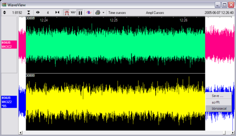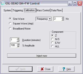 Select the calibration channel corresponding to the instrument, and choose Broadband Noise. Select a suitable duration and amplitude, and click Inject now. A new data stream, ending Cn (n = 0 – 7) or MB, should appear in Scream!'s main window containing the returned calibration signal.