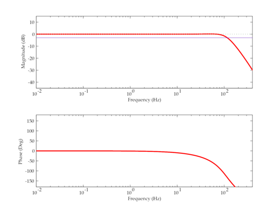 The frequency response of the CG-5TD is described in the normalised amplitude and phase plots provided. The response is measured at low and high frequencies in two separate experiments. Each plot marks the low-frequency and high-frequency cut-off values (also known as –3 dB or half-power points).