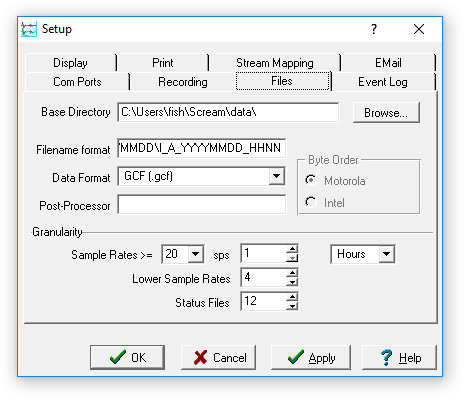 Scream! has a number of options which allow you to change the way data are recorded and filed. From the Main Window, select Setup… from the File menu to open the Setup window. Two tabs on this window control the way that Scream records incoming data: the Recording tab and the Files tab. In addition, the scream.ini configuration file can be modified with a new section that controls other aspects of data recording.