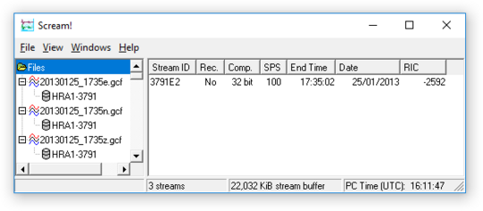 The streams will appear in Scream!'s Main Window as a group, and the Replay Control window will open; you can now replay the files as above.