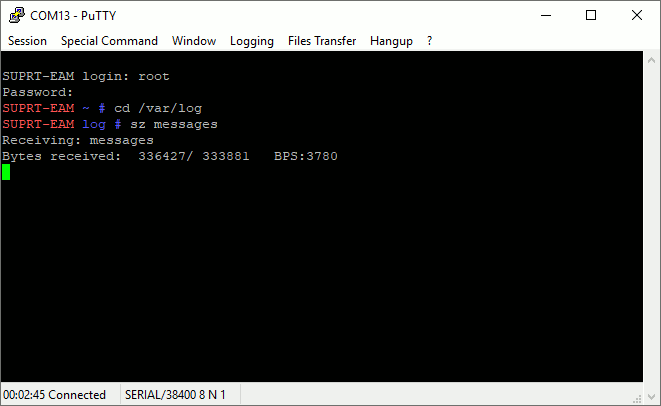 This step requires the use of a terminal emulator with support for the zModem file-transfer protocol. Güralp recommend ExtraPuTTYExtraPuTTY is an extension to Simon Tatham's free (both as in “free speech” and also as in “free beer”) and highly-recommended PuTTY software, an SSH client, telnet client and serial terminal emulator that runs under Windows and Linux. In addition to all the features of PuTTY, ExtraPuTTY provides x-modem, y-modem and z-modem file transfers over serial links. ExtraPuTTY can be downloaded from SourceForge's ExtraPuTTY page. . These instructions will assume that you are using ExtraPuTTY but the techniques involved will be very similar with any other emulator.