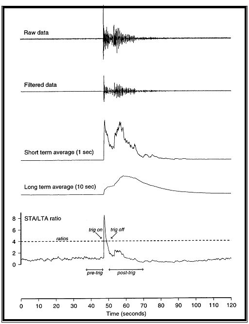 The STA/LTA algorithm applies a simple (short-term average ÷ long-term average) calculation to the triggering stream. It works by identifying sections of an incoming data stream when the signal amplitude increases. The purpose of taking a short term average, rather than triggering on signal amplitude directly, is to make it less likely that spurious spikes will trigger the device. Averaging also introduces an element of frequency selectivity into the triggering process.