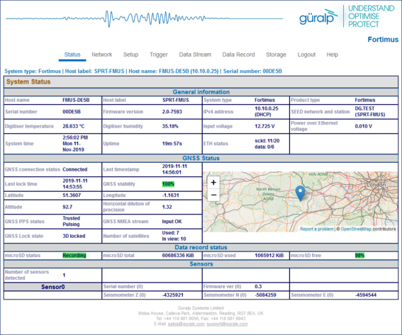 The Fortimus contains on-board firmware that presents monitoring and configuration interfaces. These are accessible through Güralp’s Discovery software (see Section 3.3) or, with the built-in web server, via Discovery's browser interface or any standards-conformant web browser.