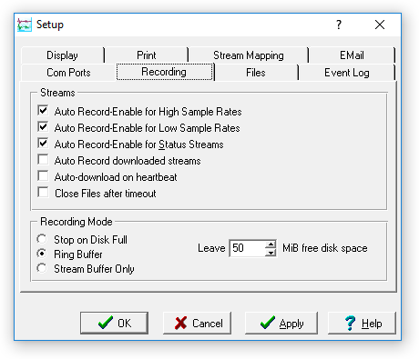 Scream! has a number of options which allow you to change the way data are recorded and filed. From the Main Window, select Setup… from the File menu to open the Setup window. Two tabs on this window control the way that Scream records incoming data: the Recording tab and the Files tab. In addition, the scream.ini configuration file can be modified with a new section that controls other aspects of data recording.